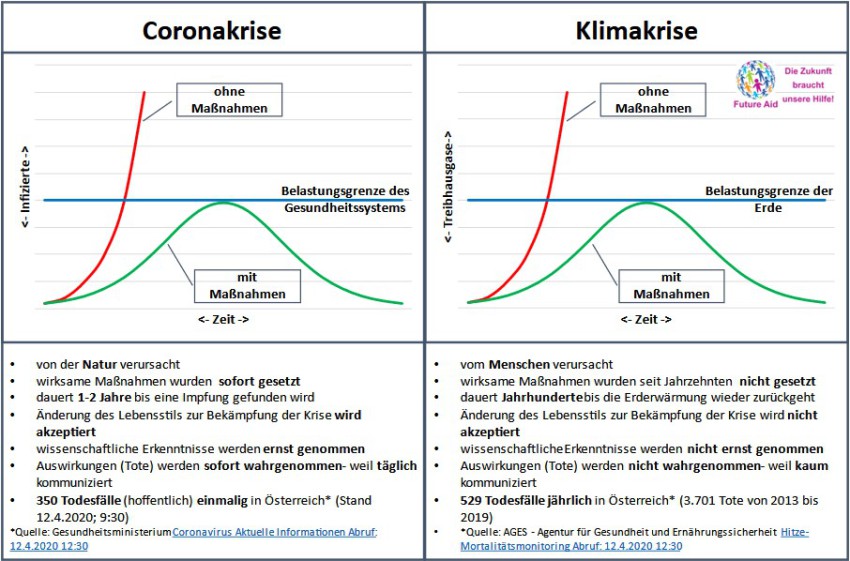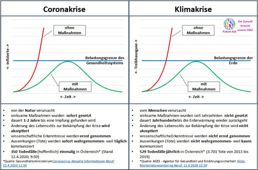 So verständlich das auch ist, ändert es jedoch nichts an der Tatsache, dass die Klimakrise bereits heute in Österreich jedes Jahr mehr Tote (529) verursacht[1] als die Coronakrise bisher (368; Stand 13.4.2020; 15:00). Langfristig betrachtet ist die Klimakrise dramatisch schlimmer, als es die Coronakrise je sein kann, weil