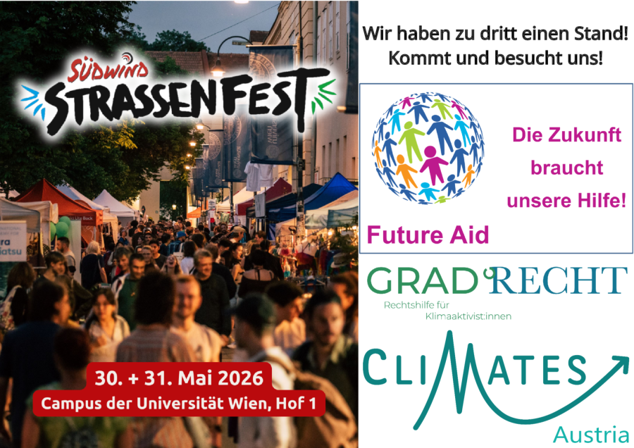 Future Aid ist heuer zum dritten Mal am Südwind Straßenfest. Um das Informationsangebot an unserem Stand vielfältiger zu machen, haben wir die Klimaschutzorganisationen Grad Recht und CliMates Austria eingeladen, den Stand mit uns gemeinsam zu betreiben. Grad Recht ist eine Organisation, die Rechtshilfe für Klimaaktivist:innen anbietet. Mehr über Grad Recht findest du hier: Grad Recht. CliMates Austria ist eine Klimaschutz-Jugendorganisation mit verschiedenen Aktivitäten. Mehr über CliMates Austria findest du hier: CliMates Austria.